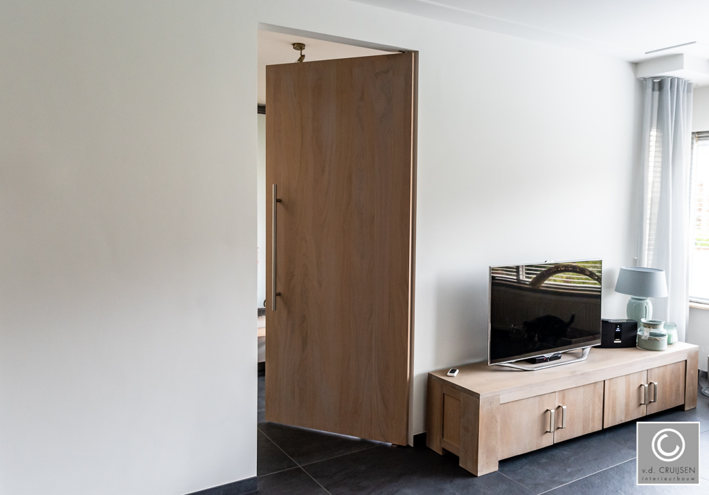In Kaatsheuvel mochten we aan de slag met het ontwerpen én realiseren van een aantal mooie interieuprojecten: we maakten een keuken, haardmeubel en we verzorgden de meubels op badkamer en toilet. De woonkamer werd voorzien van een imposante deur.